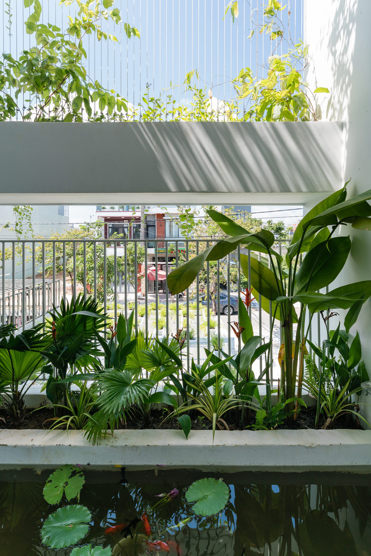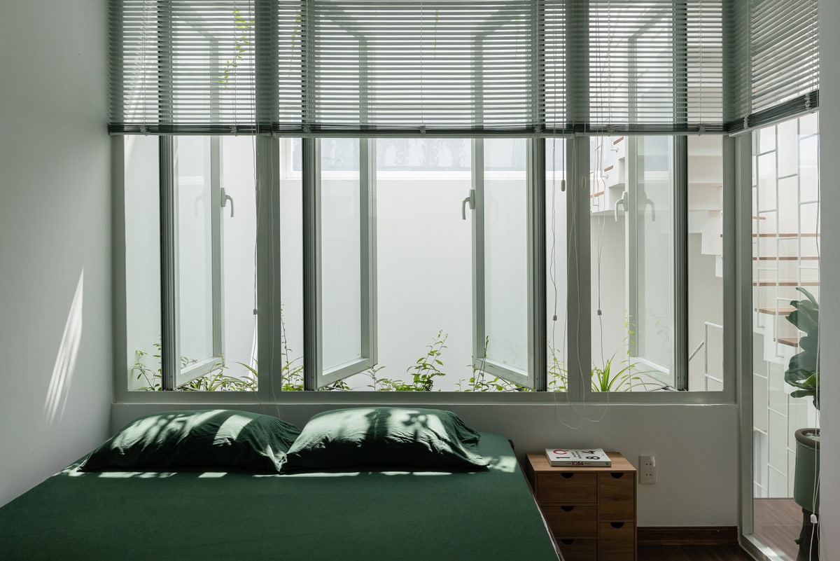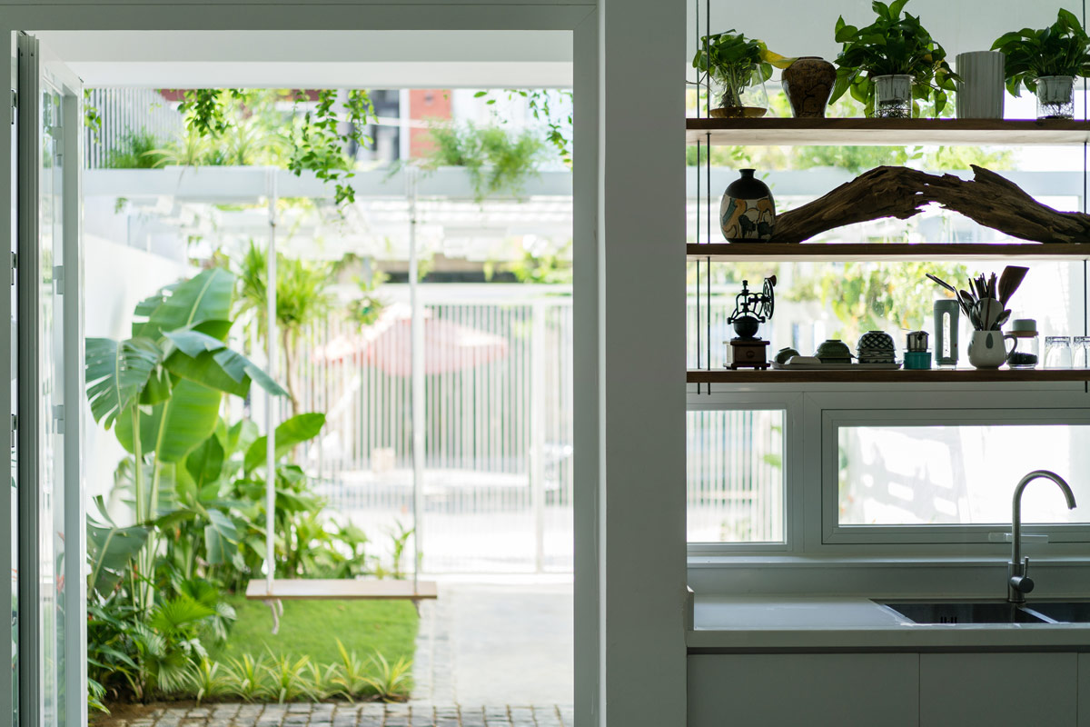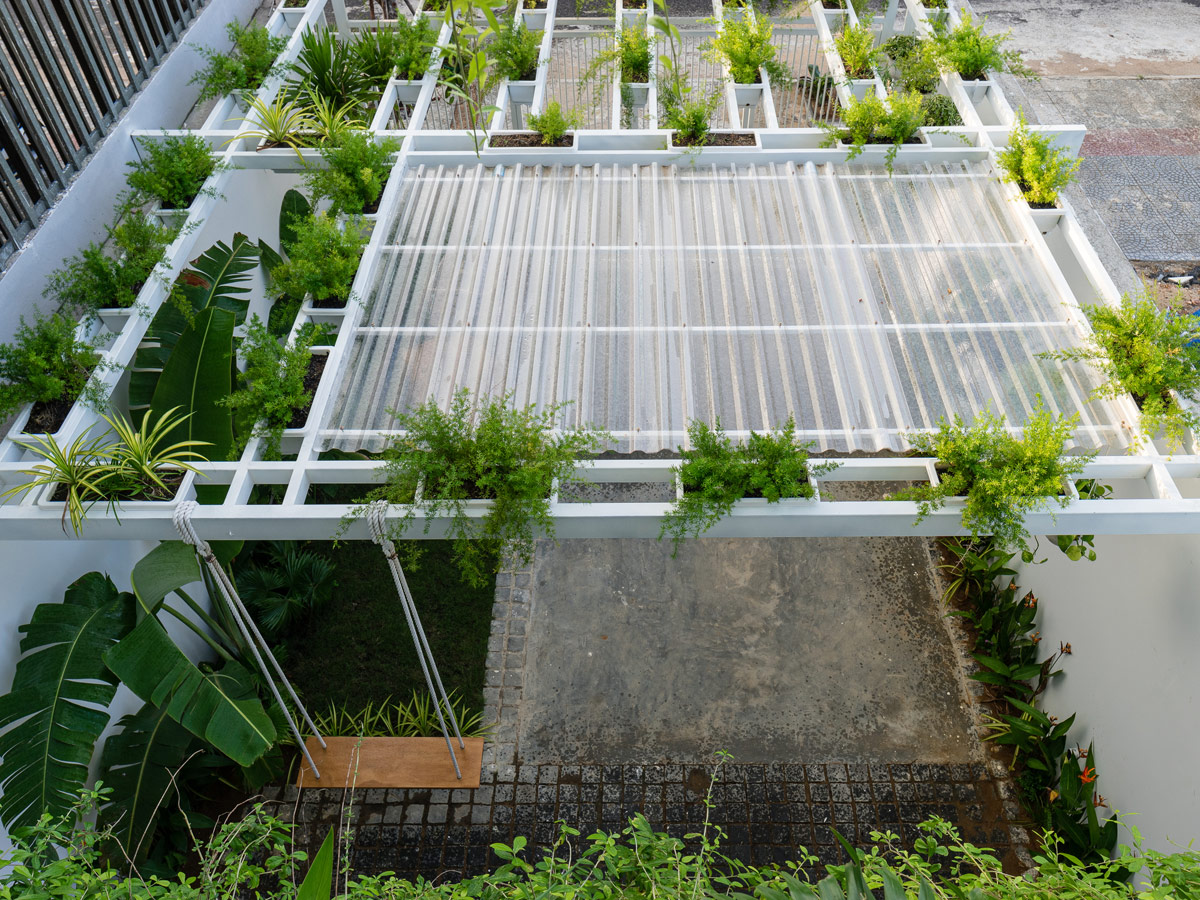 Как и в других густонаселенных городах, городские дома во Вьетнаме имеют лишь небольшие участки земли, отсутствие естественного освещения и вентиляции. Это были проблемы, которые команда архитекторов поставила перед собой задачу решить в первую очередь. Подъездная дорожка, которая также должна была быть доступна для парковки автомобиля, была превращена в природный порог. Штаны уходят корнями в ламели крыши беседки над подъездной дорожкой, вдоль нее проходит узкая грядка с висящими кашпо наверху.