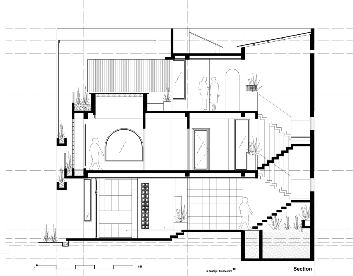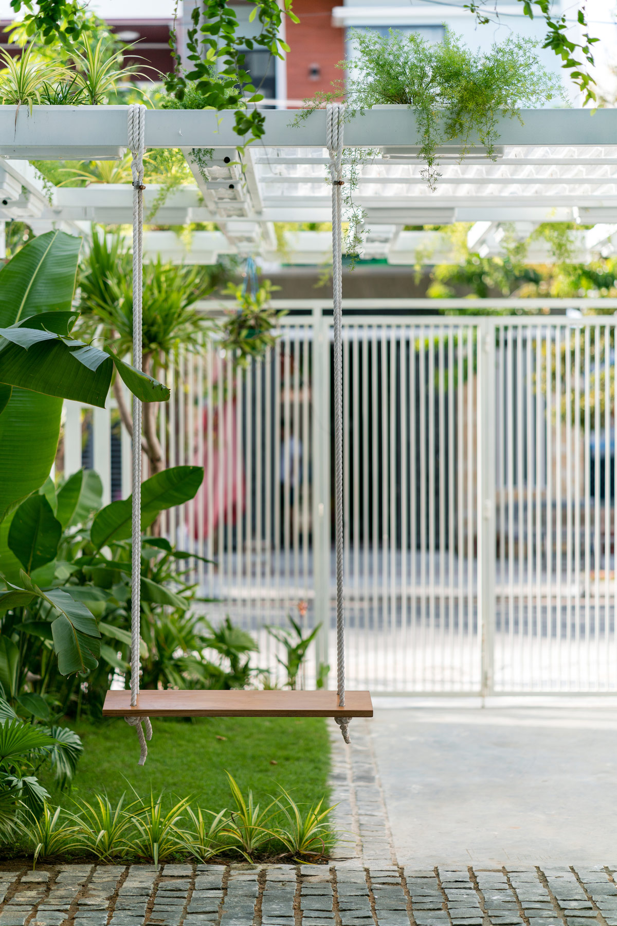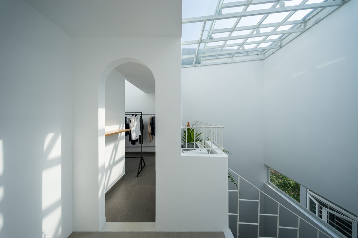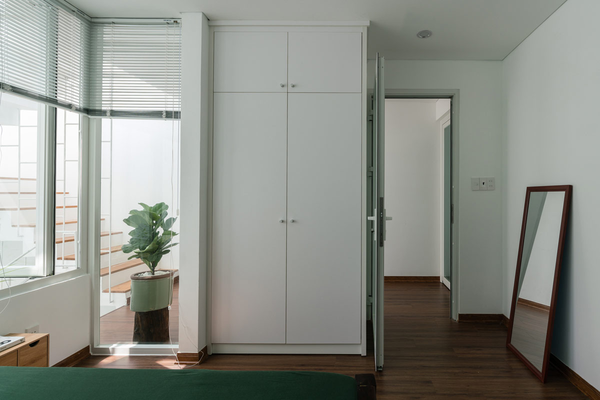 Как и в других густонаселенных городах, городские дома во Вьетнаме имеют лишь небольшие участки земли, отсутствие естественного освещения и вентиляции. Это были проблемы, которые команда архитекторов поставила перед собой задачу решить в первую очередь. Подъездная дорожка, которая также должна была быть доступна для парковки автомобиля, была превращена в природный порог. Штаны уходят корнями в ламели крыши беседки над подъездной дорожкой, вдоль нее проходит узкая грядка с висящими кашпо наверху.