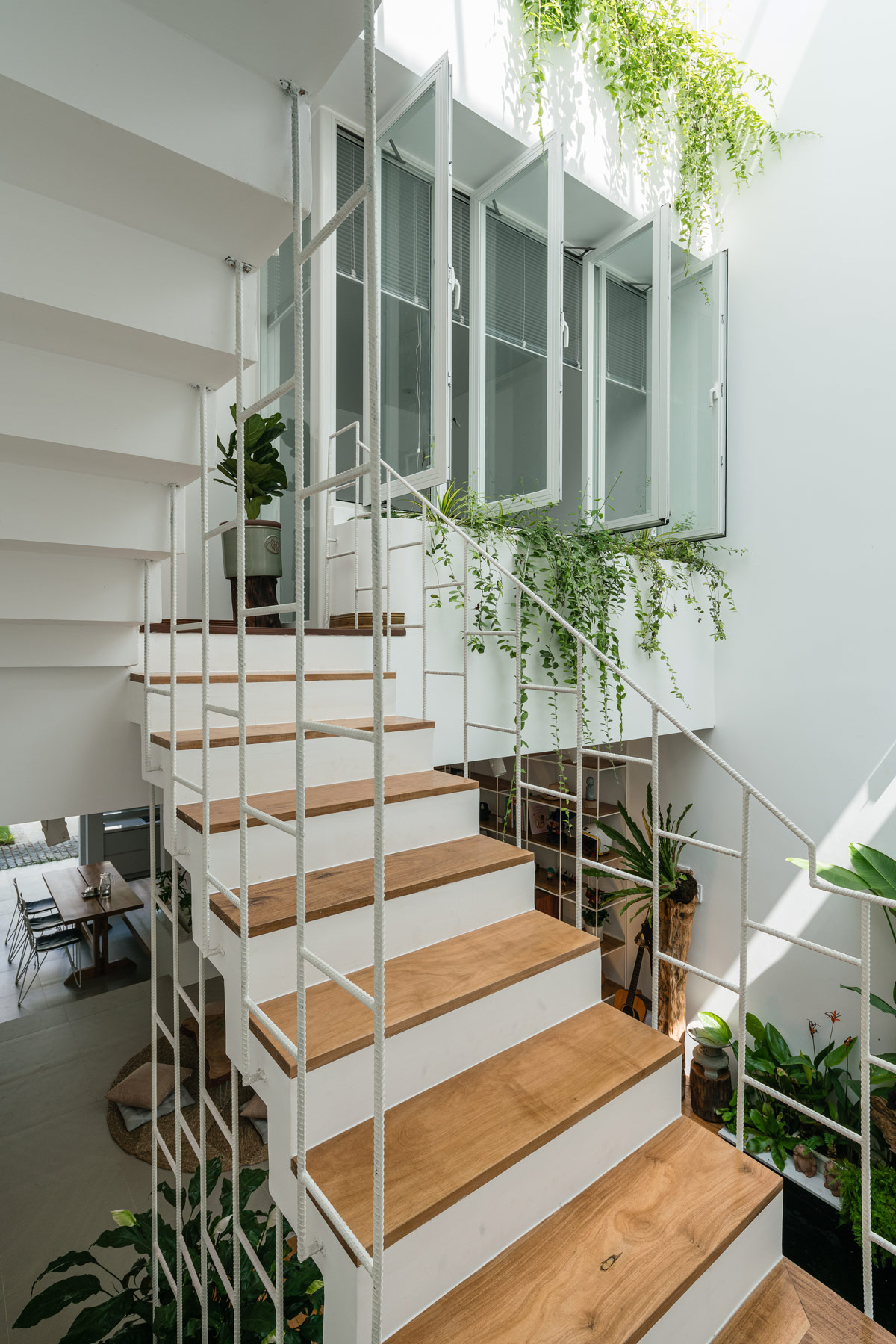 Открытые стороны конструкции лестницы обеспечивают свободное движение воздуха по всему дому, а также пропускают великолепный естественный свет.