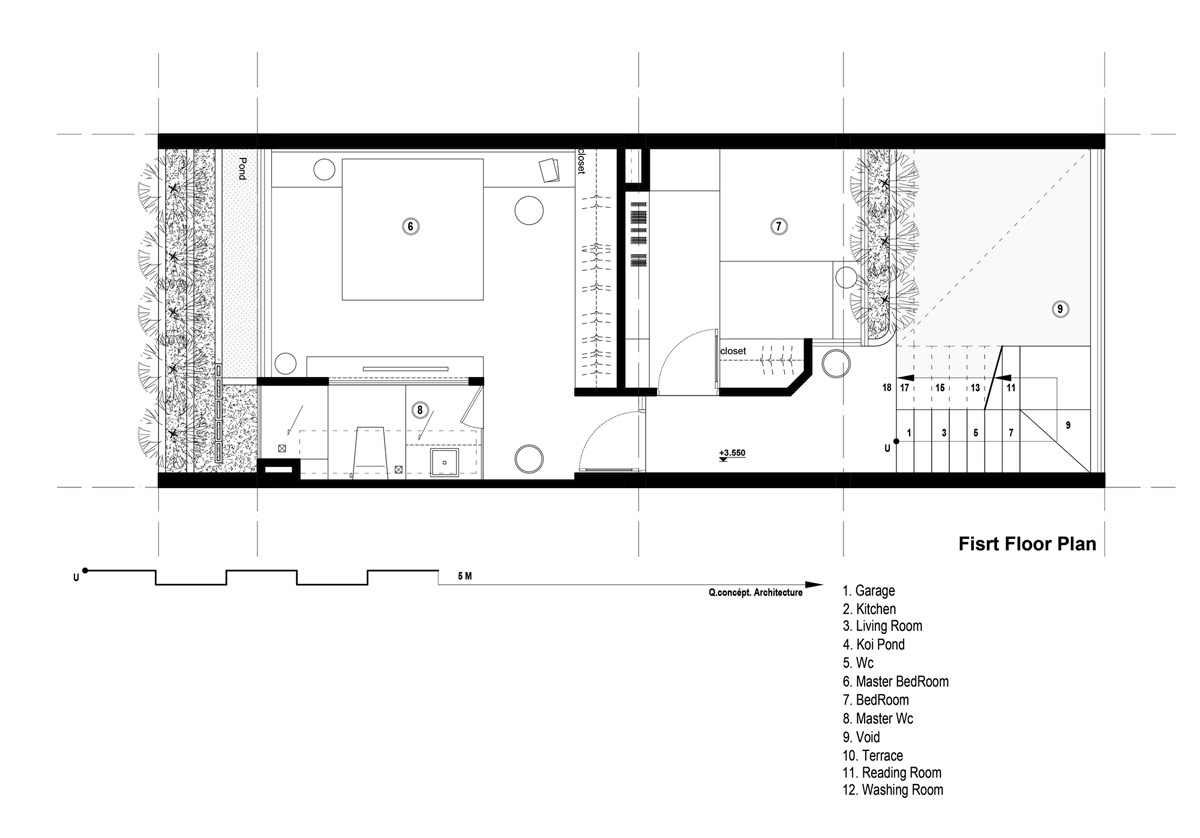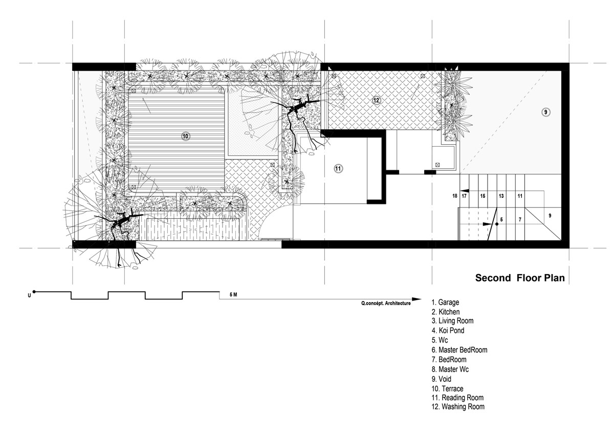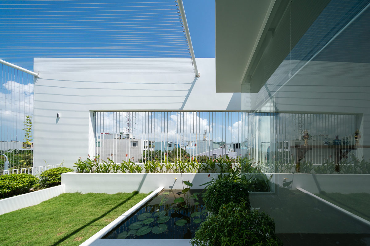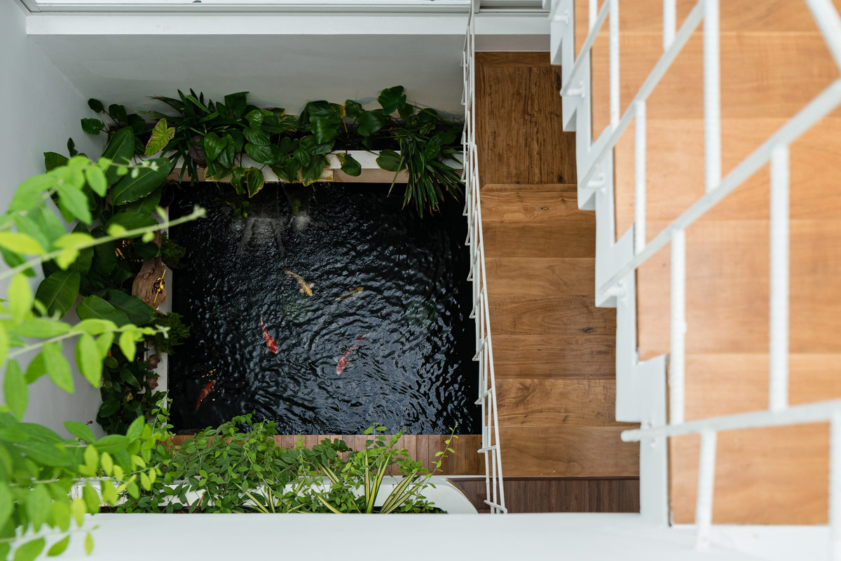 Крытая палуба пересекает зону отдыха и крытый пруд с карпами. Домовладельцы сформировали концепцию этого дома с любовью к природе, растениям и рыбам. До этого места пара жила в крошечных студиях, что делало их несчастными. На этот раз они были полны решимости реализовать дом, полный света и воздуха, место с естественной атмосферой, которое они могли бы назвать своим домом. Архитекторы использовали местные материалы и нейтральные цвета, чтобы завершить видение.