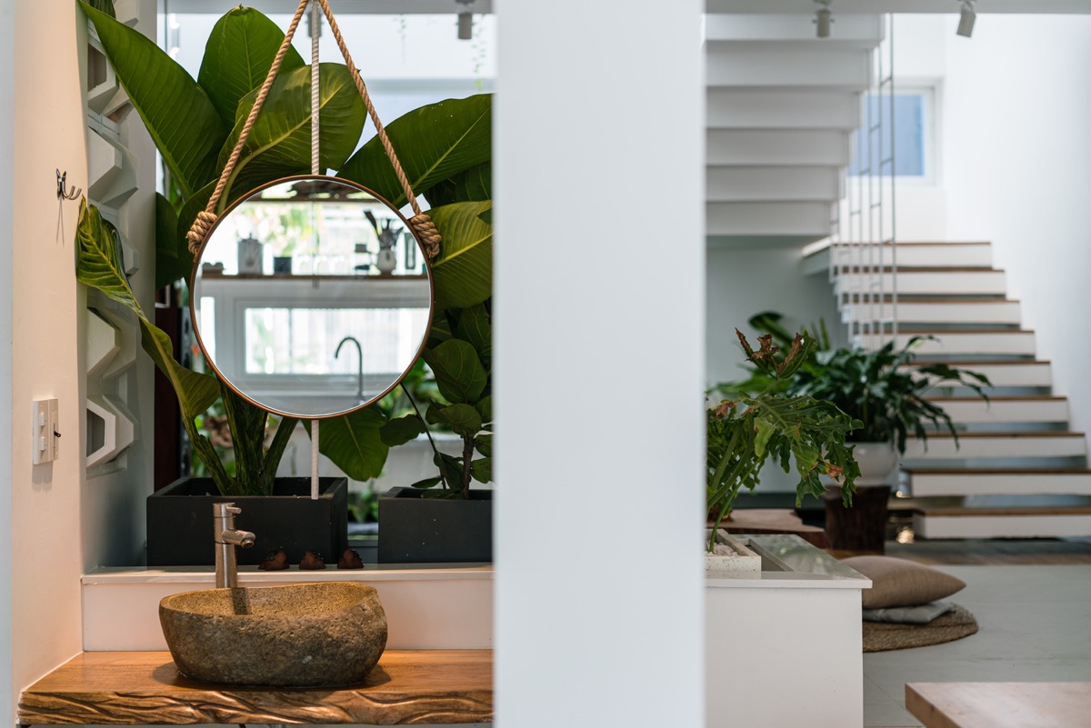 Комнатные растения процветают по всей тропической гостиной, из встроенных плантаторов, бордюров и отдельно стоящих горшков. Растения и деревья играют незаменимую роль в дизайне этого дома, создавая природную энергию, которая помогает создать расслабляющее пространство, несмотря на небольшой размер комнат.