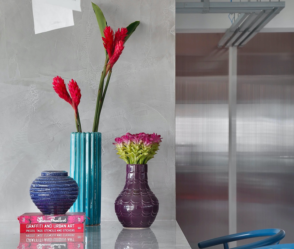 Декоративные вазы разного цвета добавляют яркости серому обеденному столу и необработанному бетонному декору обеденной зоны.