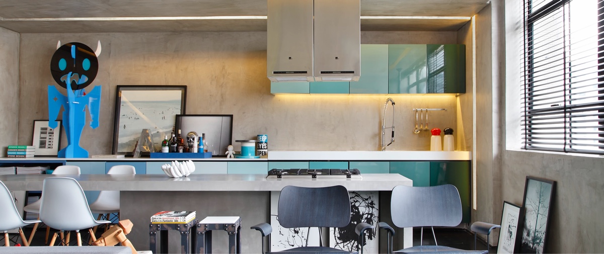 Горячие разноцветные акценты и холодный бетонный интерьер