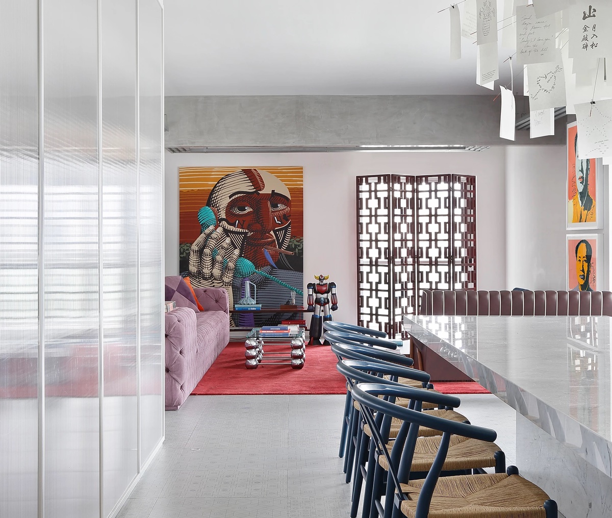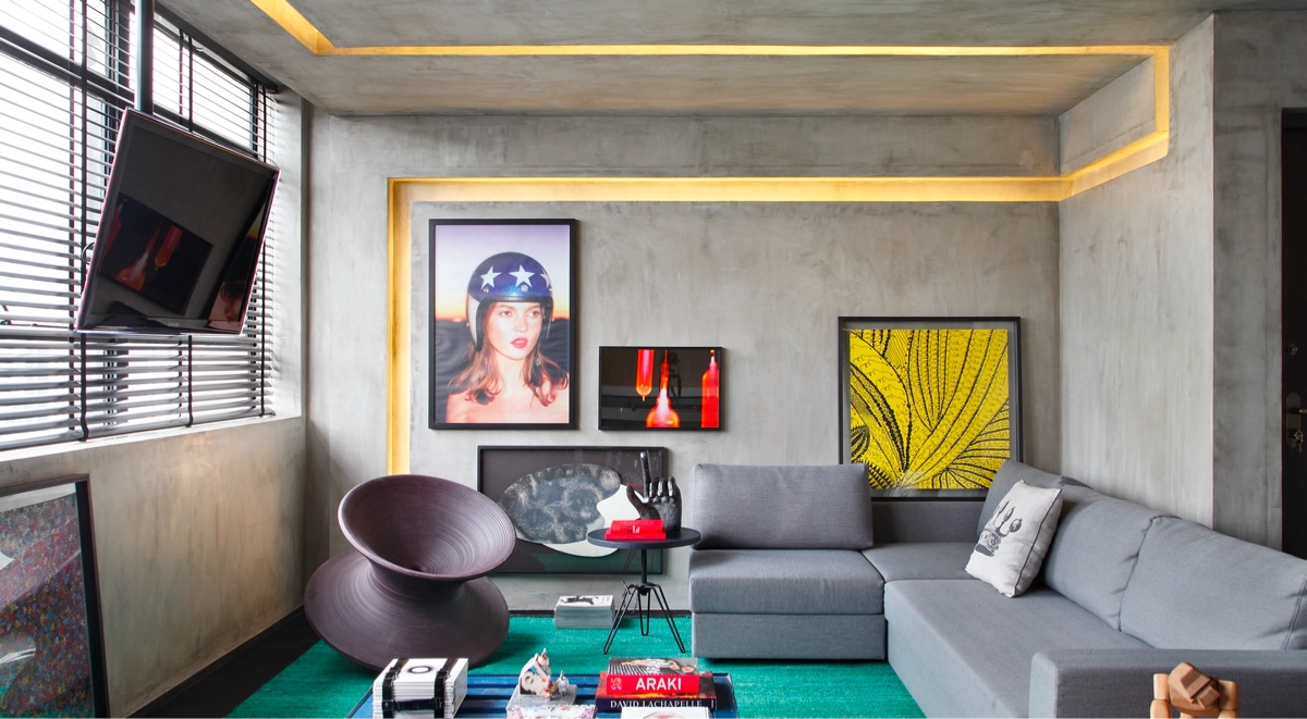 Первый интерьер представляет собой собственность площадью 248 квадратных метров с гостиной открытой планировки. Яркие произведения современного искусства развешаны по периметру бело-бетонного зала, а художественные игрушки и скульптура протискиваются сквозь середину.