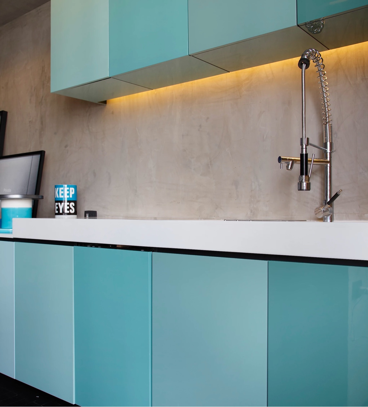 Спектр синих переходов на стене кухни, на фасадах глянцевых плит.