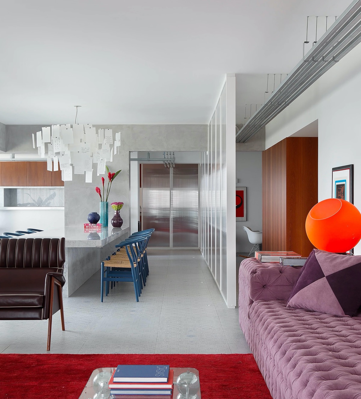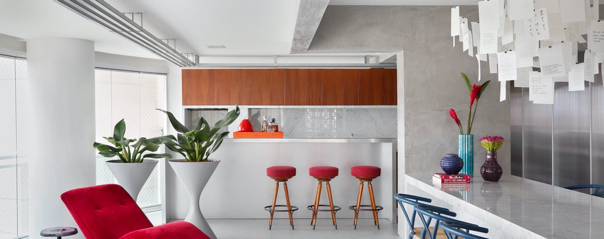 Плантаторы в виде песочных часов выровнены со структурной колонной, образуя тонкую перегородку между гостиной и кухней. Красный шезлонг и красные кухонные барные стулья создают цветовую гармонию.