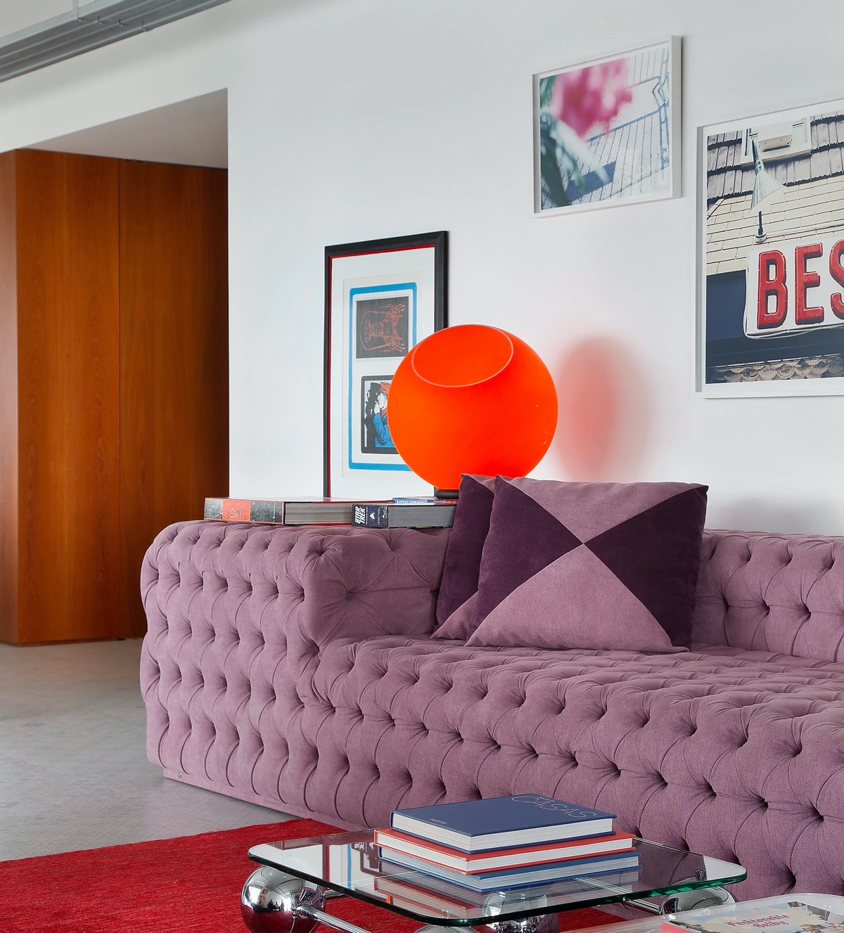 Тафтинговый диван кладет блок сливово-фиолетового цвета вдоль края гостиной. На сцену врывается настольная лампа с большим оранжевым пузырем.
