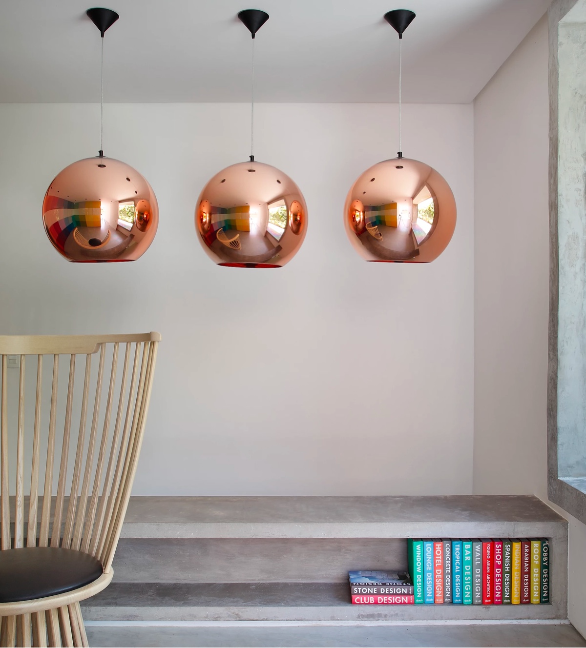 Медные подвесные светильники выстроились вдоль уголка для чтения, где была отлита изготовленная на заказ бетонная скамья, в основании которой есть место для хранения книг.