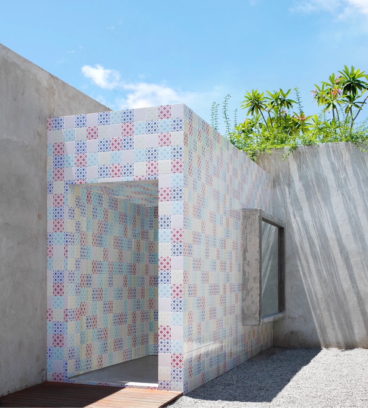Плитка, покрывающая стену столовой, играет и на внешней стороне дома, создавая гостеприимный вход.