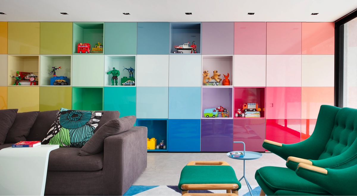 Наверху лестницы мы попадаем в более семейную, детскую гостиную. Стены красочных объемов хранения работают через всю радугу.