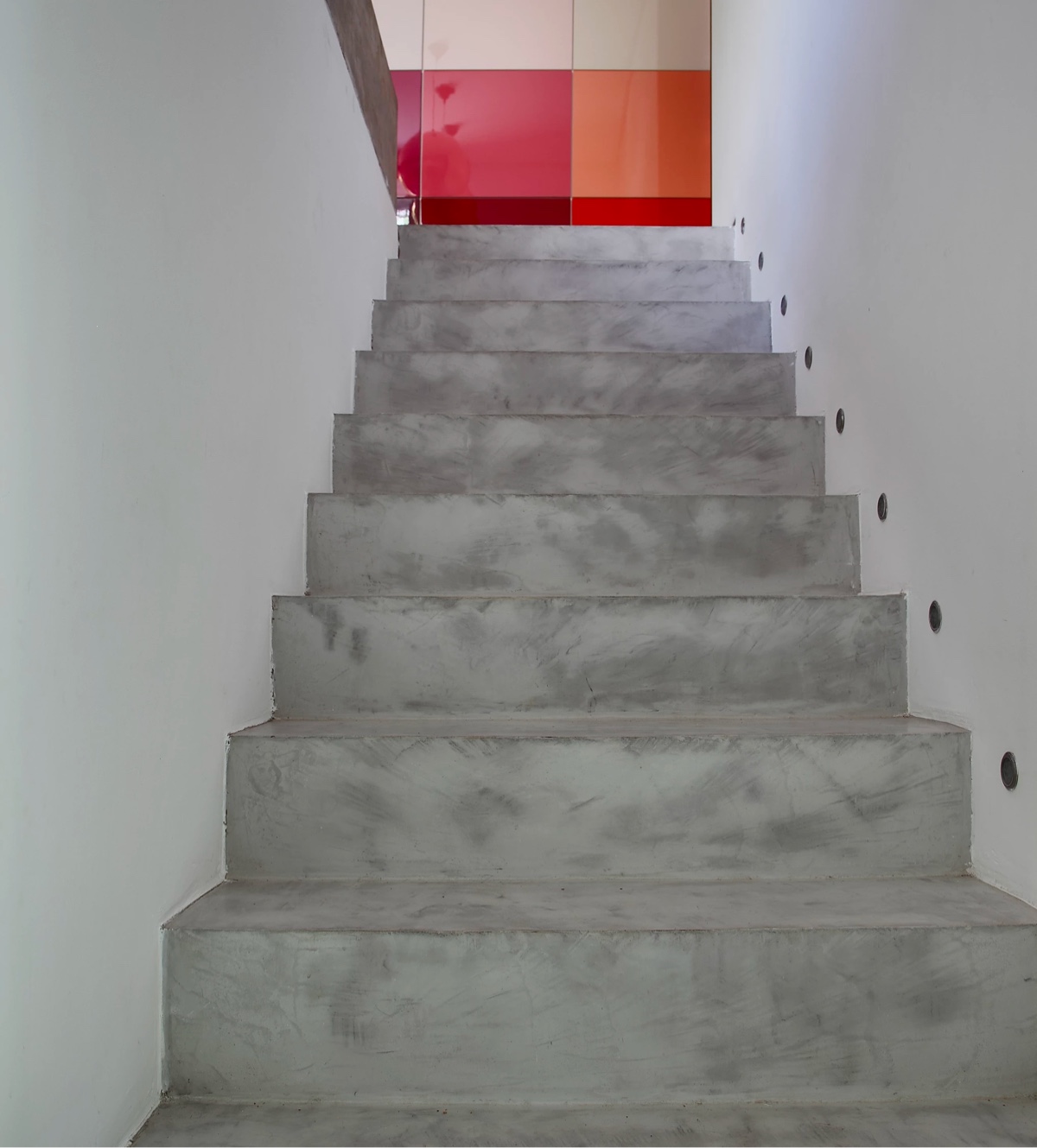Между этажами поднимается бетонная лестница, освещенная светодиодными лестничными светильниками.