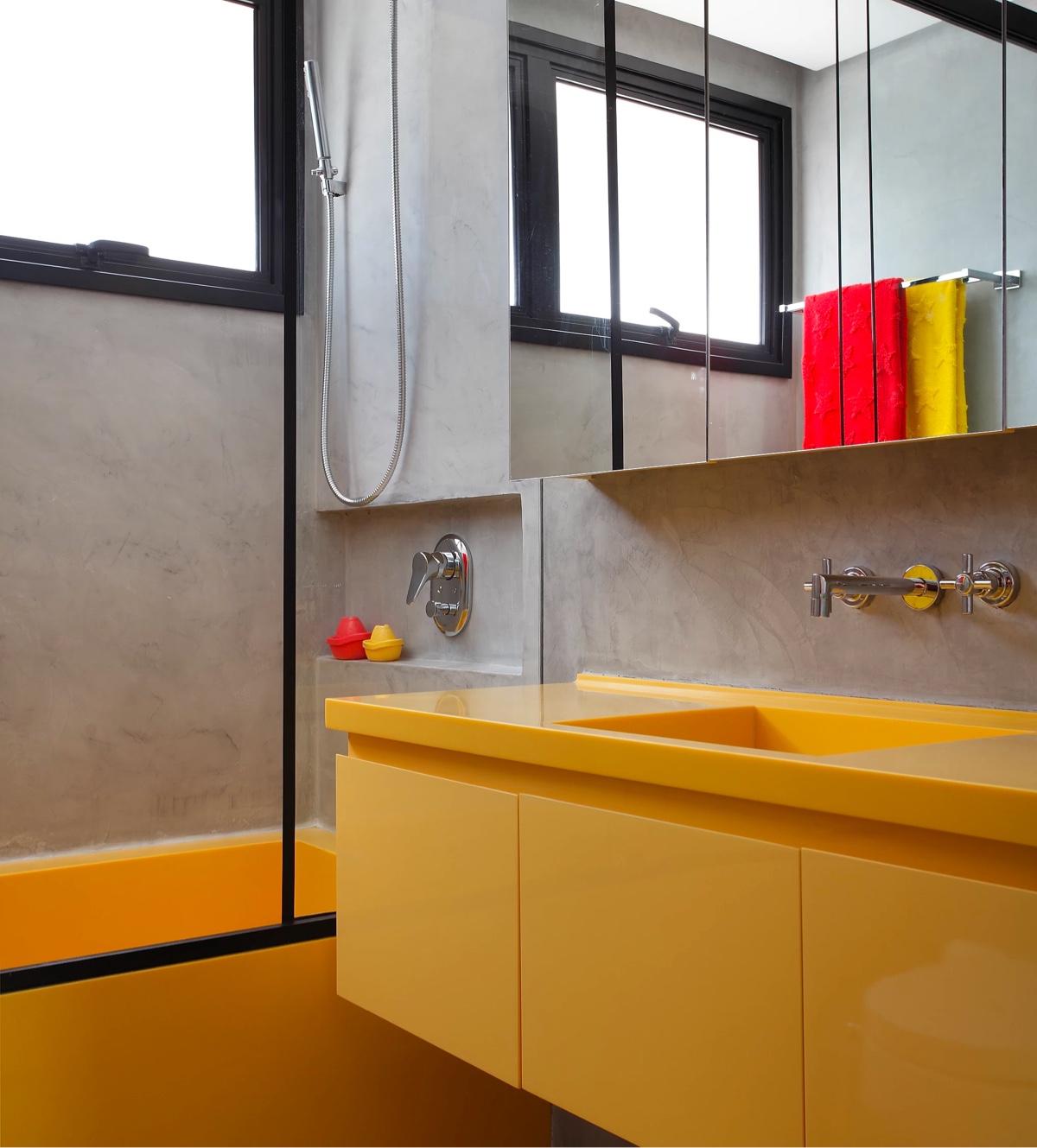 Желтая мебель для ванной весело сияет внутри бетонной ванной комнаты.