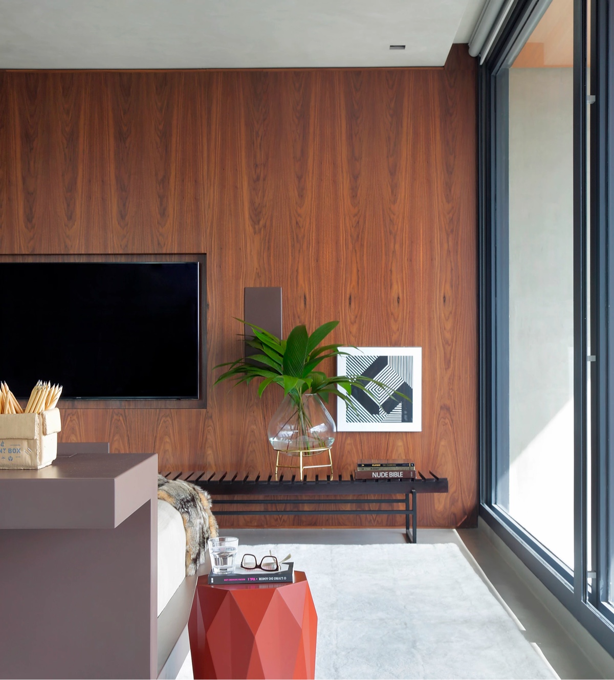 Деревянные панели также использовались для утопления телевизора и динамиков вместе с соответствующей проводкой. Стеклянная ваза с зеленью дополняет стену из темного дерева.