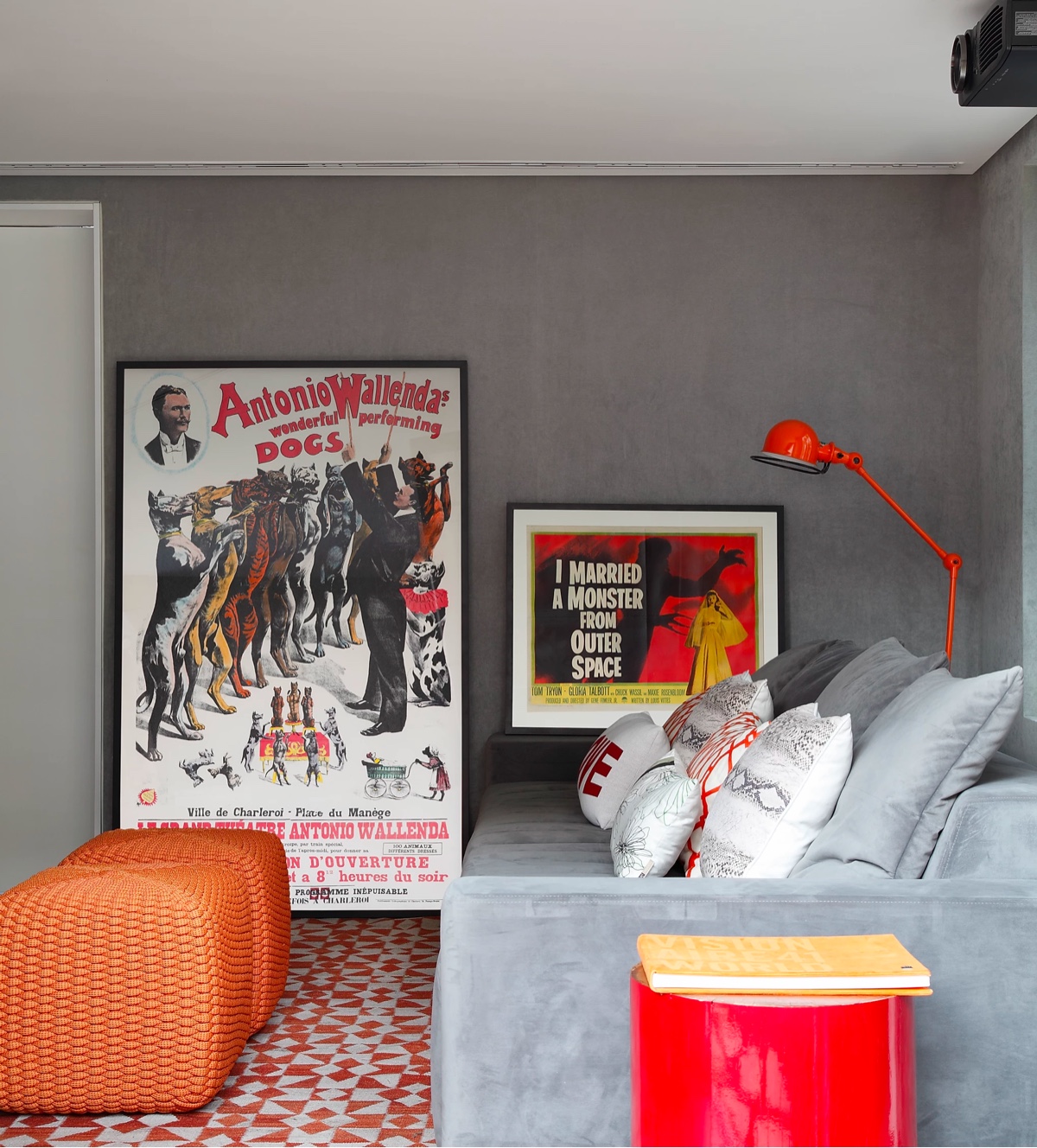 Другие стены остаются сырым бетоном. Красные и оранжевые акценты разогревают индустриальную эстетику.